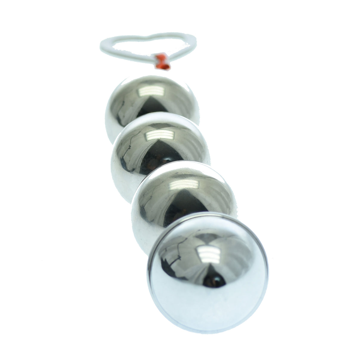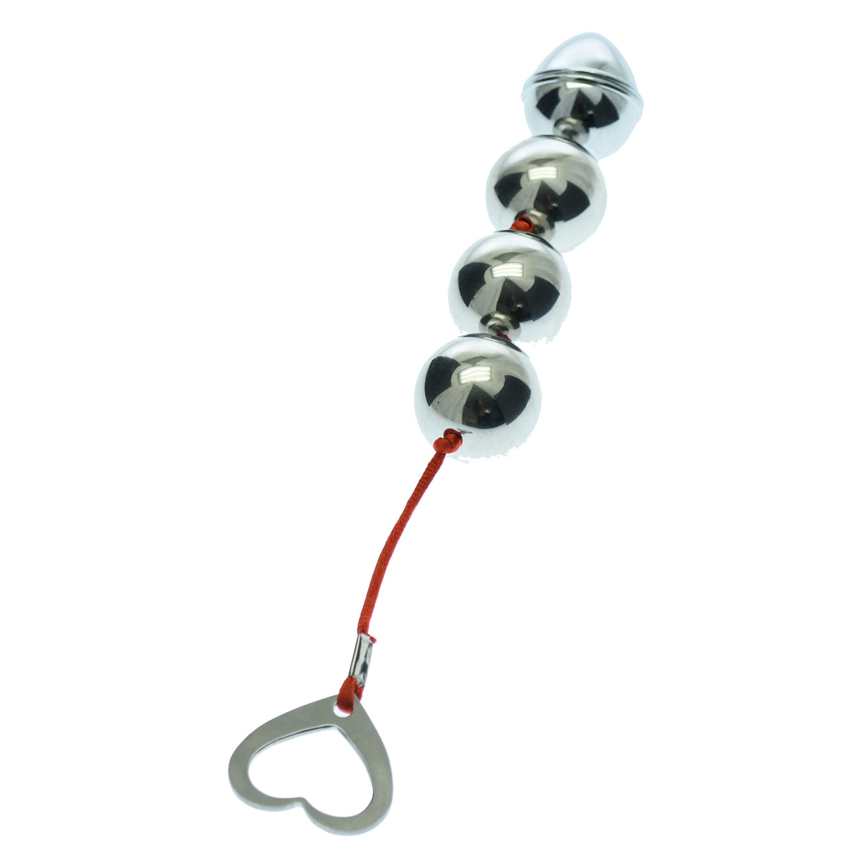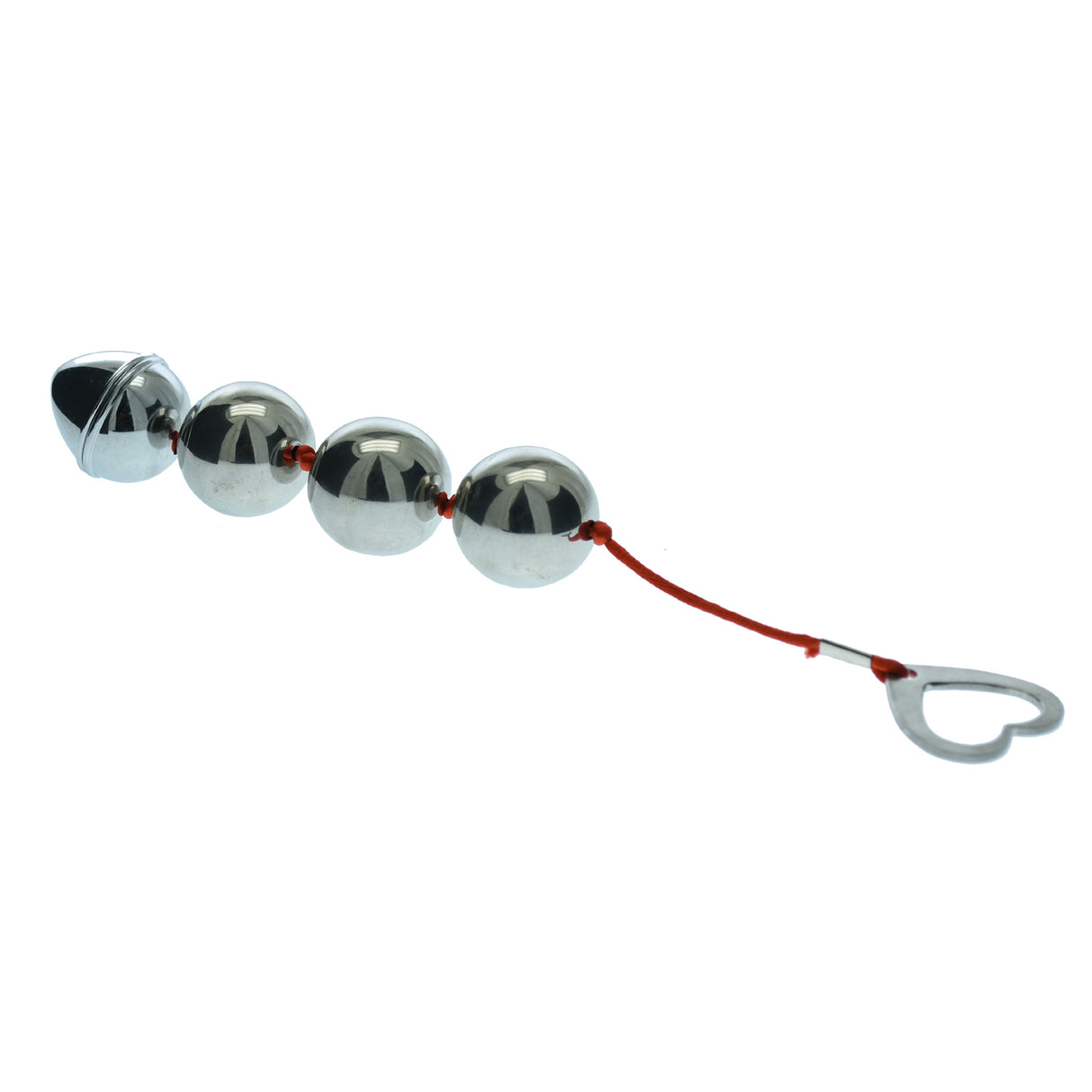Amplify your anal stimulation with our lightweight metal Anal Beads.  Featuring four balls to play with, and a ridged end bead.The heart shaped metal removal loop ensures safe insertion and easy removal. Give the beads a coating of anal lubricant for extra slip for your play.  These beads are Phlalate and Latex Free. Can be Warmed or Cooled for Added Sensations, and water proof.