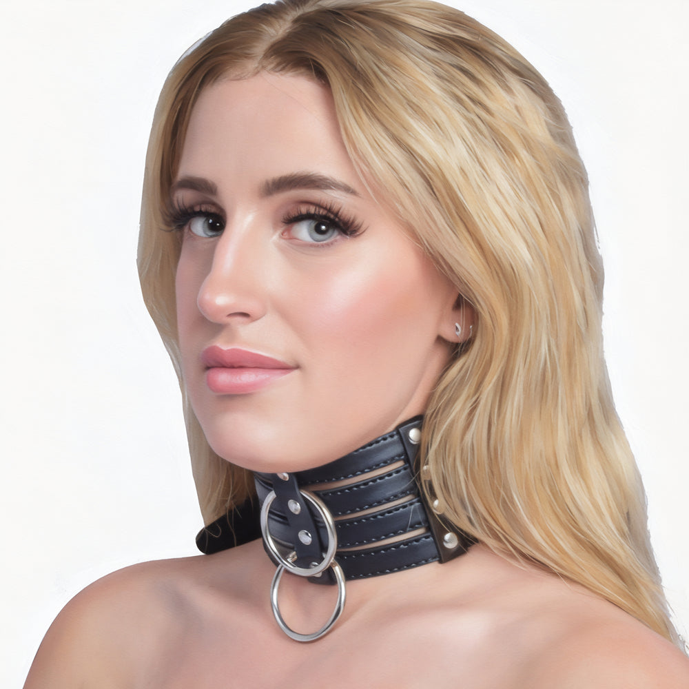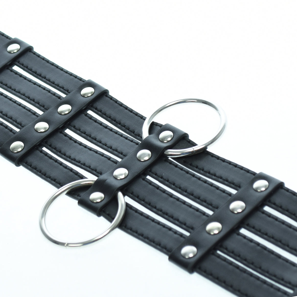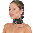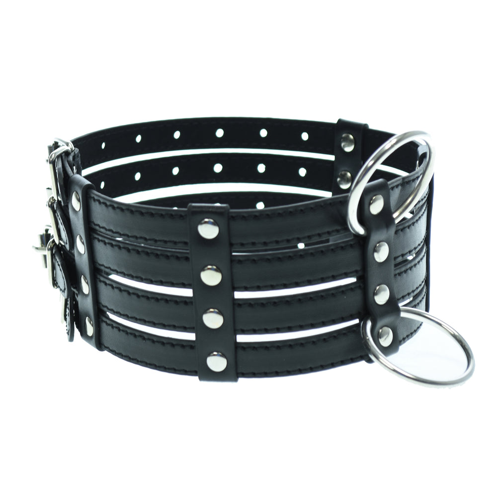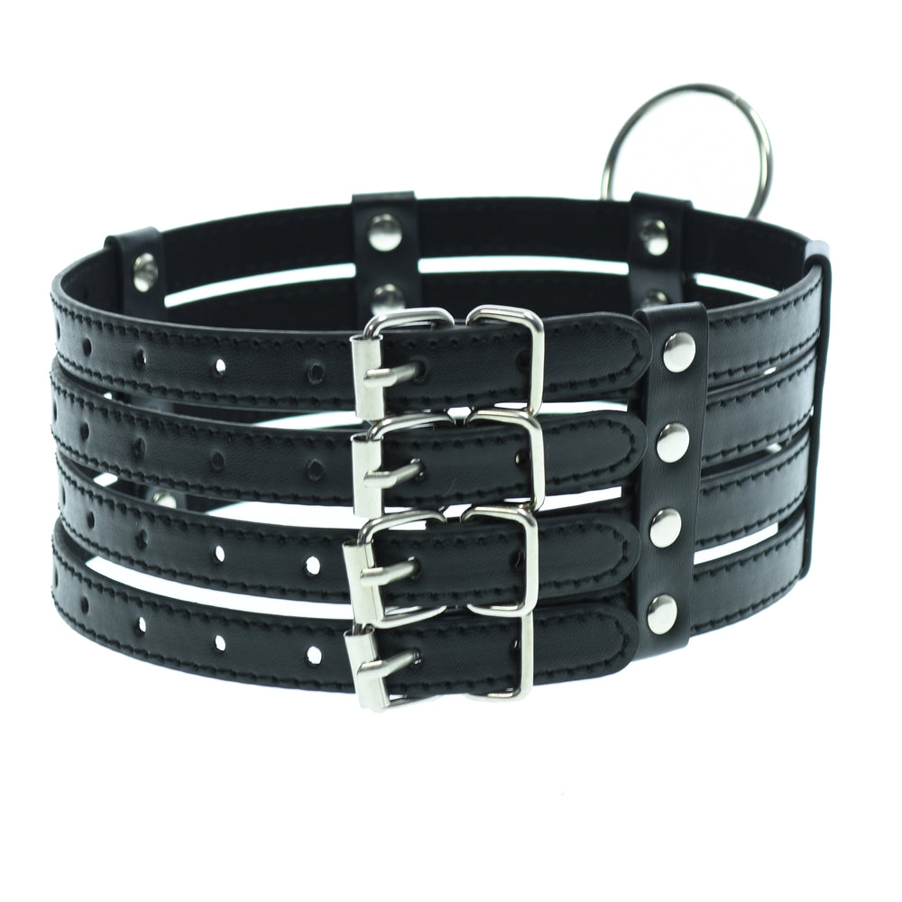 This Fashionable Collar creates an illusion that your sub is wearing 4 chokers. Manufactured with soft synthetic PU leather. Two 1.5" O-ring at front makes for easy leash attachment, unique design makes a impressible fashion statement.