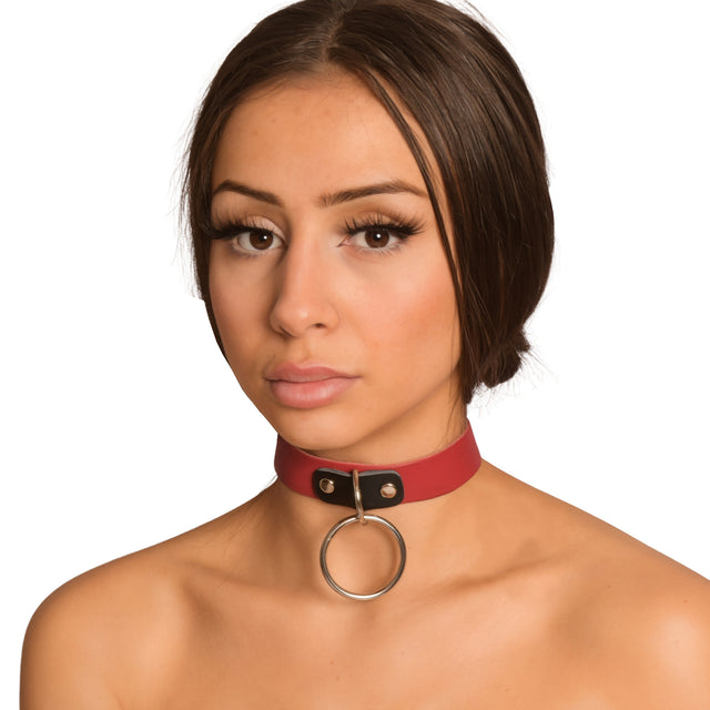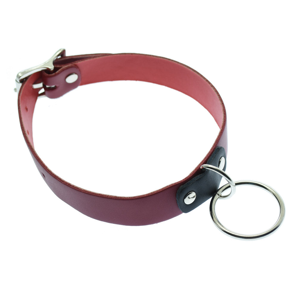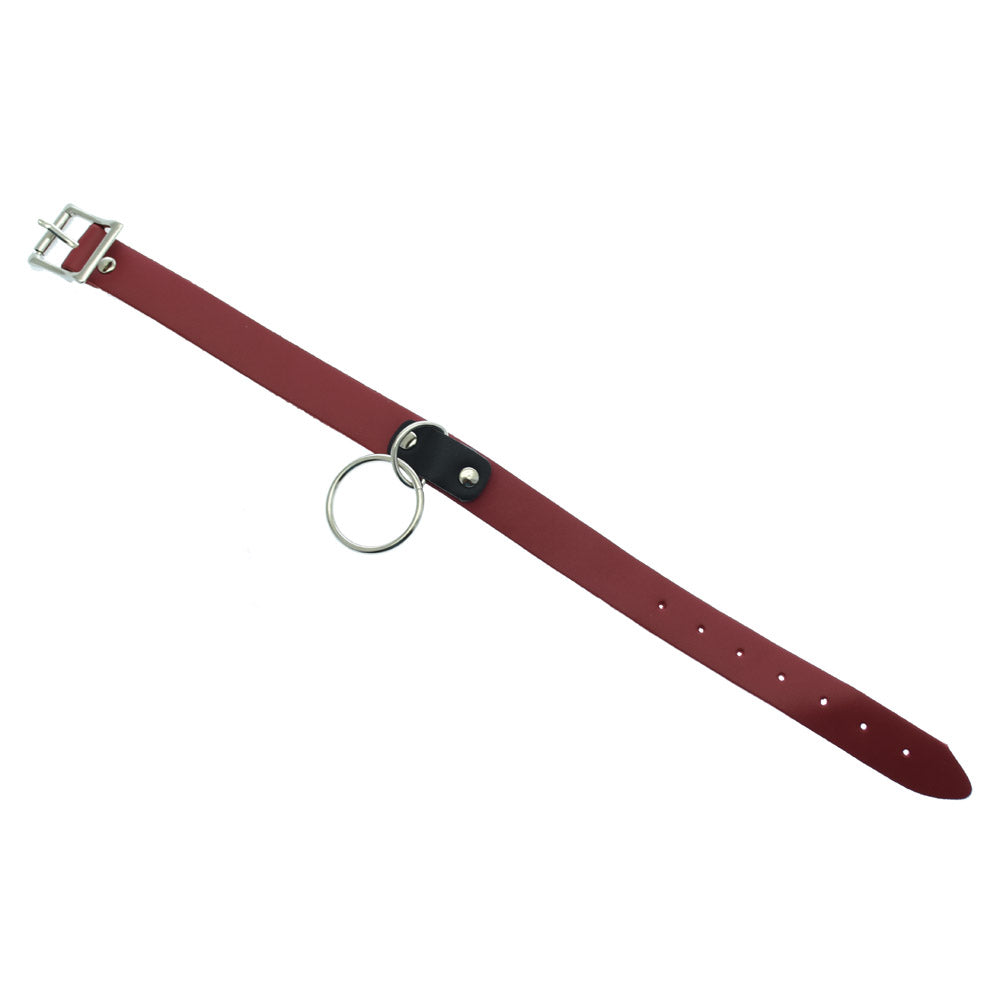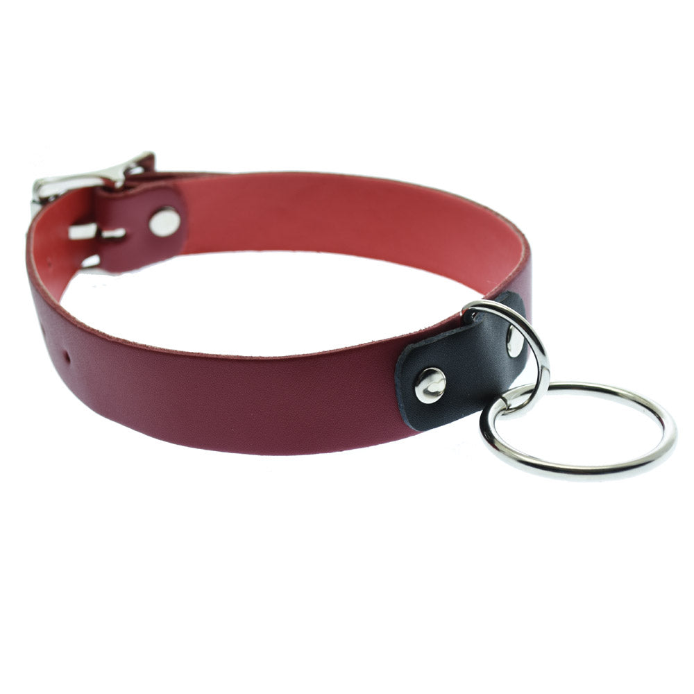 Red leather neck collar features o ring to attach your sub as you see fit.This classic collar has metal hardware and adjustable buckle closure.This high quality collar is sure to please over and over again.
