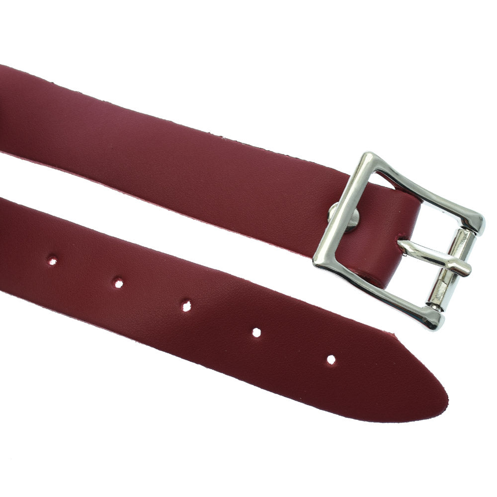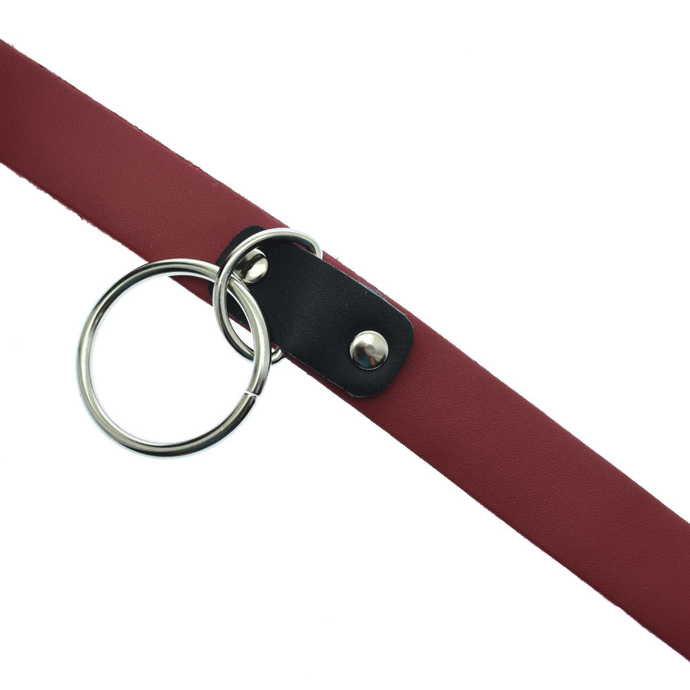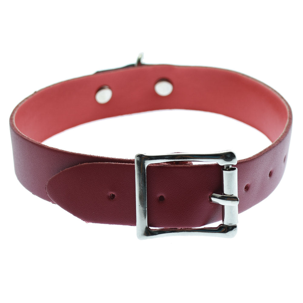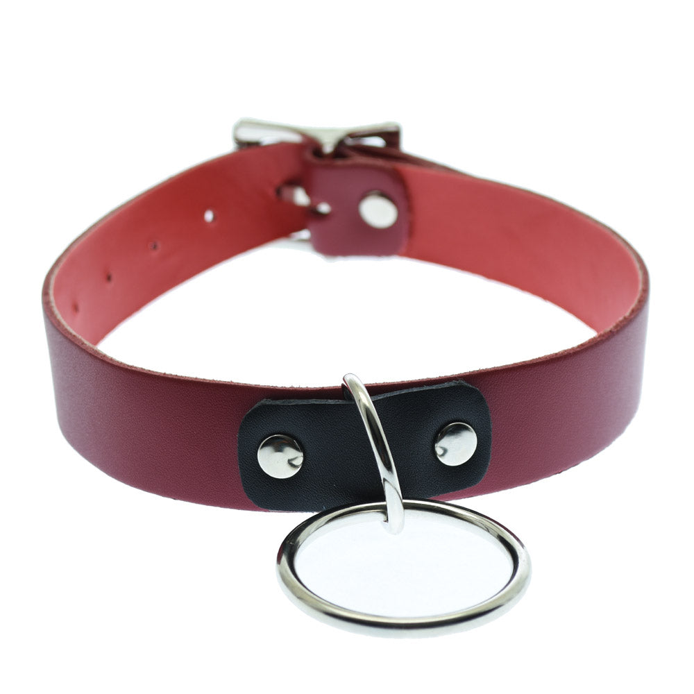 Red leather neck collar features o ring to attach your sub as you see fit.This classic collar has metal hardware and adjustable buckle closure.This high quality collar is sure to please over and over again.