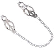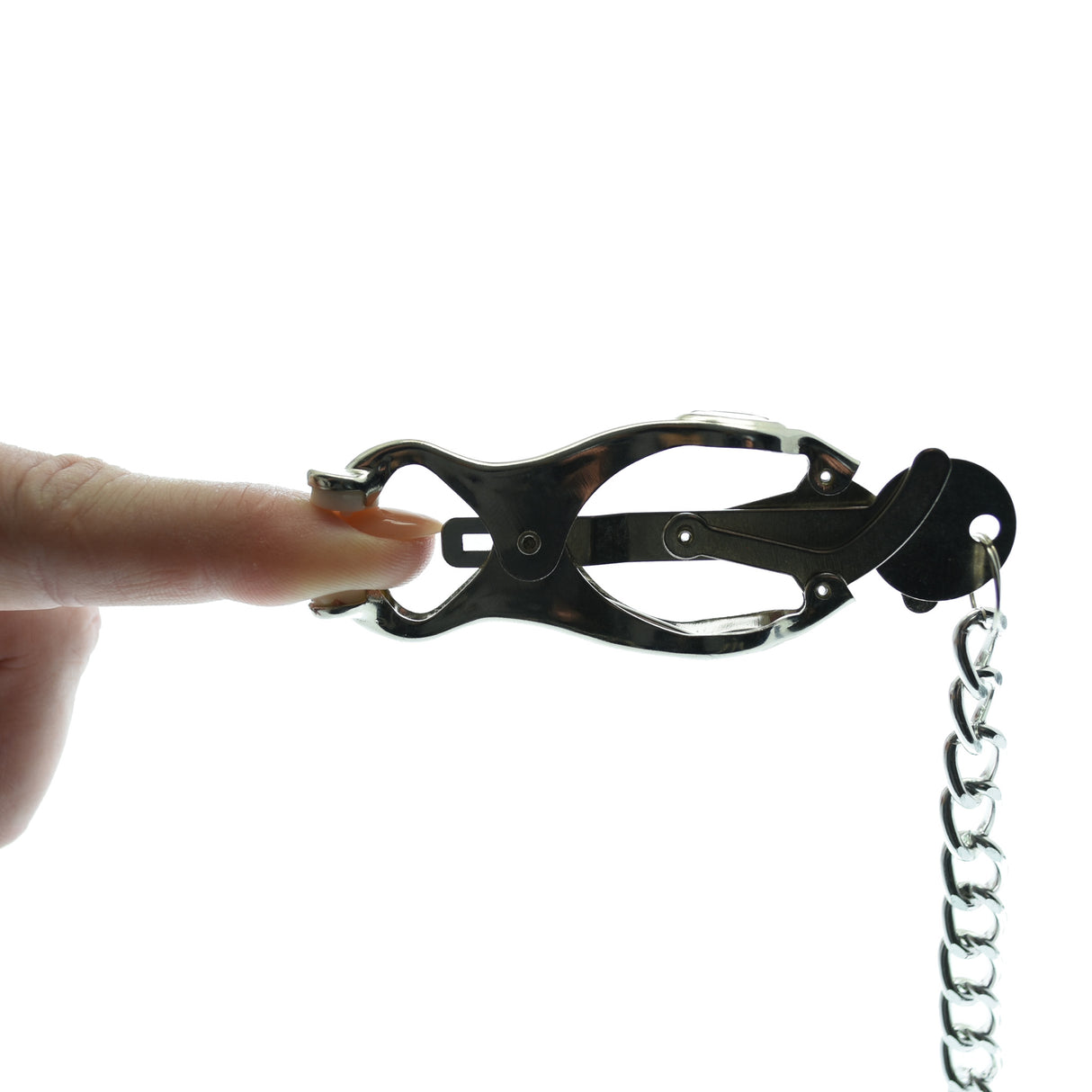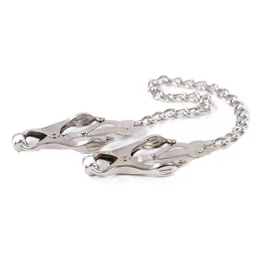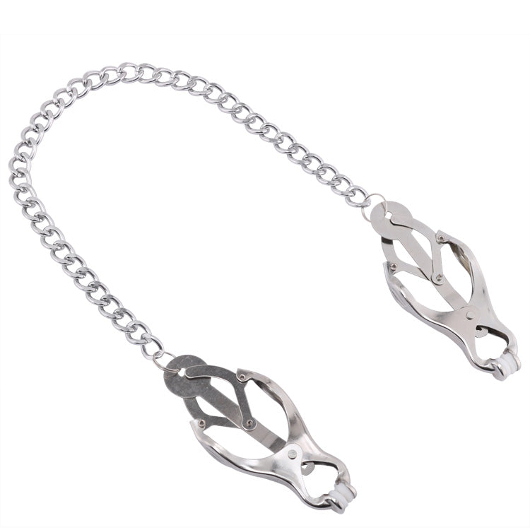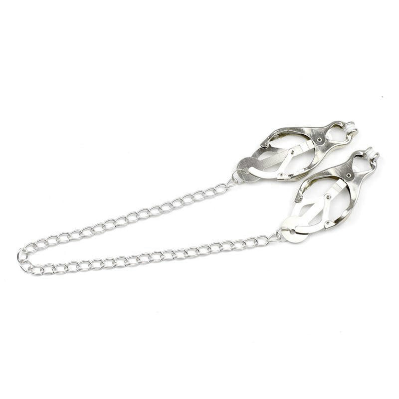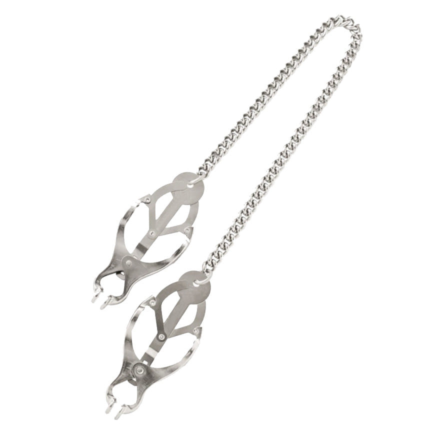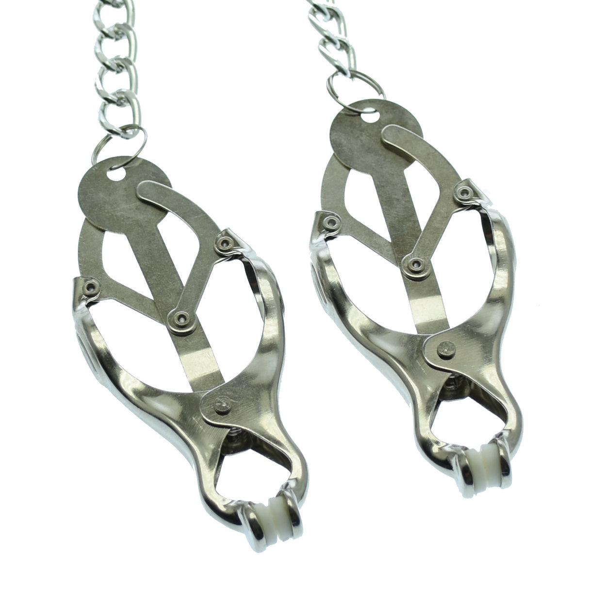 Classic Japanese clover clamps with a 12" chain always look astonishing with a little bit of spice.The rubber white cushion tips buffer the nipple squeeze intensity. Elegant and not for the faint of heart. Linked by a chain, these nipple clamps get slightly tighter when you pull; however, they already have a very firm grip even when you aren't pulling on the chain. Ideal for... nipple play, nipple fetish, sensation play, BDSM.
