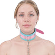 Elevate your bondage experience with our elegant Blue & Pink Neck Collar. Made from vibrant vegan leather, the collar includes a light blue leash and D link attachment. Perfect for a touch of color and control.